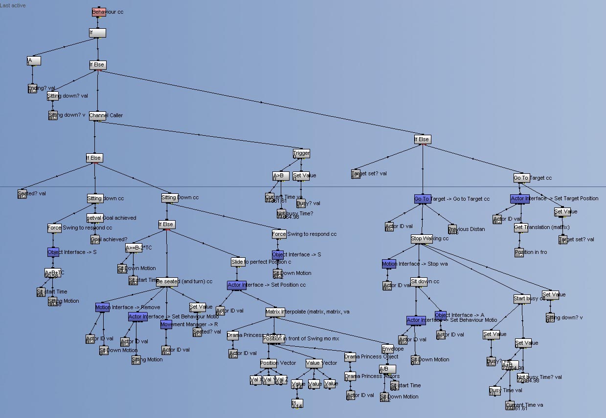 This is what part of The Path looks like in Quest3D (this makes a character walk to a swing and sit down):