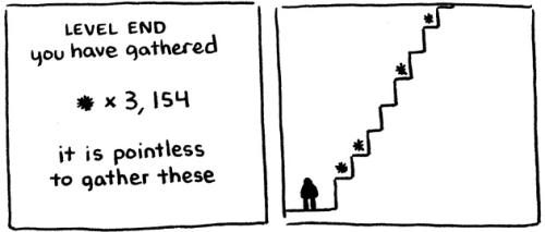 "Points in games are an antiquated remnant of an age when video games were monoliths that sat in pizza parlors. Clusters of friends would pile in on Friday nights to devour mountains of greasy pepperoni, play some Galaga and tag their high score with initials as a way to challenge future players. Years later, while back in their home town for high school reunions they would end up back there, astonished by the fact that their initials were still sitting in the top 10, never knocked off the charts by some unknown assailant.