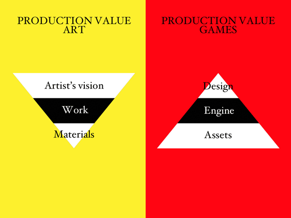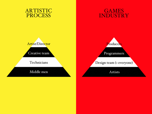 Here's two slides about that from our Let's make art with games presentation, investigating the differences between games industry production and artistic production: